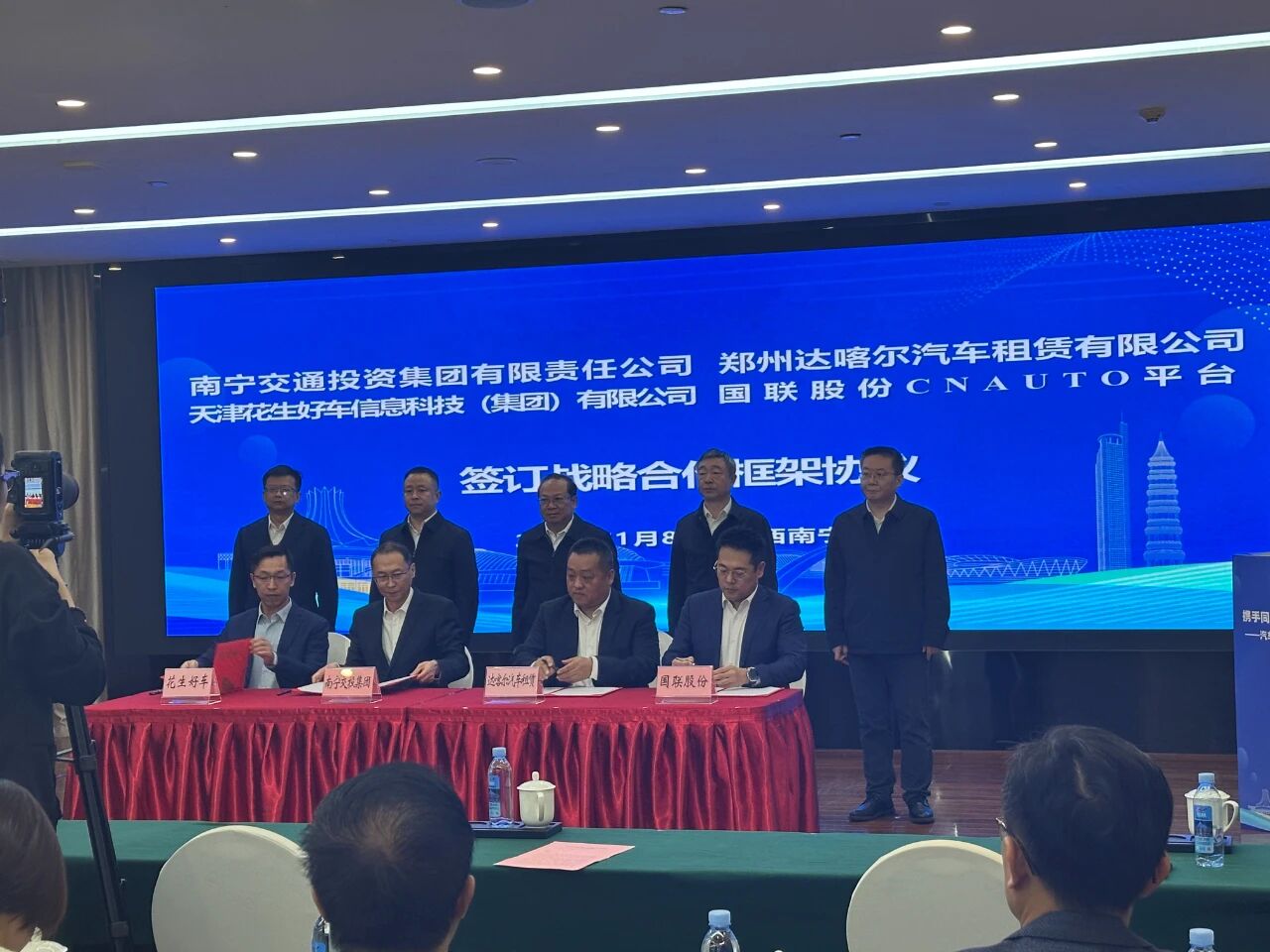 签约仪式上,南宁交通投资集团与国联股份CNAUTO平台、郑州达喀尔汽车租赁有限公司、天津花生好车信息科技(集团)有限公司签署战略合作框架协议。南宁交通投资集团与中国汽车工业进出口总公司、中国贸易促进会汽车分会、郑州东工实业有限公司签署业务合作意向协议。