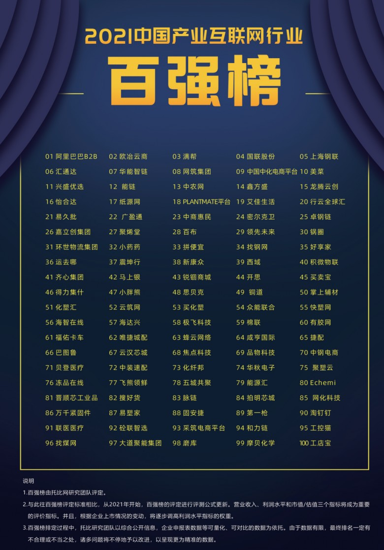 12月1-2日,中国产业互联网年会在南京盛大召开。国联股份获评“2021中国产业互联网百强榜前十强”。前十强分别为:阿里巴巴B2B、欧冶云商、满帮、国联股份、上海钢联、汇通达、华能智链、网筑集团、中国化工电商平台、美菜。