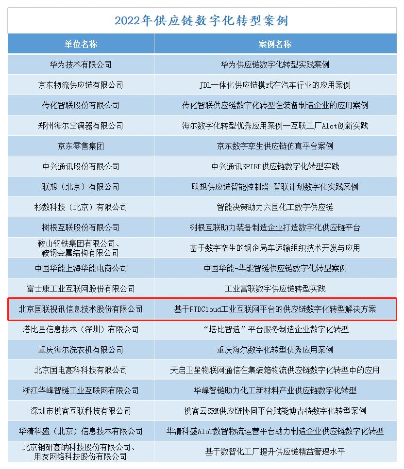 近日,工业互联网产业联盟公布了“2022年供应链数字化转型案例”名单,华为、京东等单位名列其中。国联股份凭借“基于PTDCloud工业互联网平台的供应链数字化转型解决方案”案例成功入选。