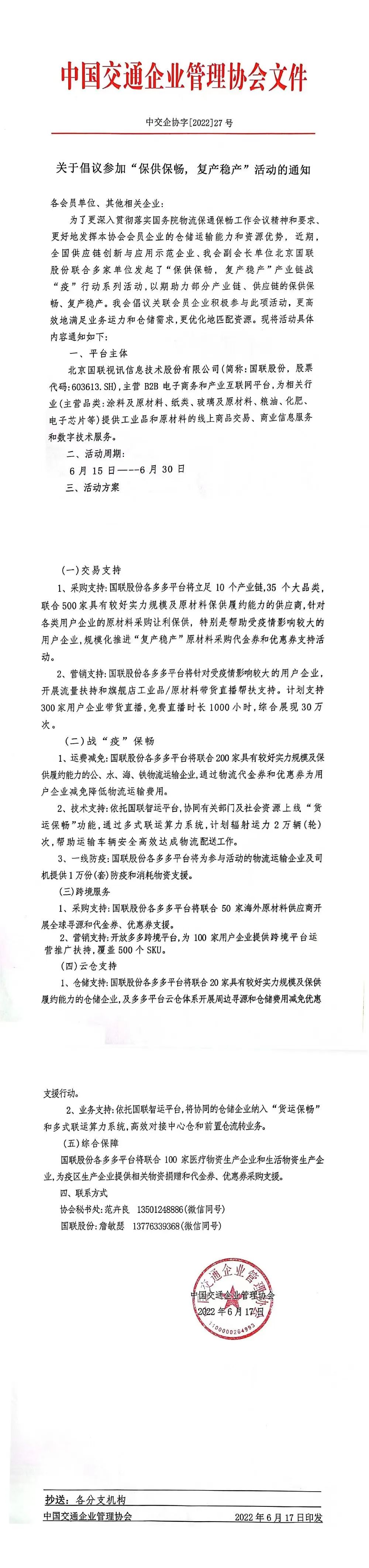 6月17日,中国交通企业管理协会发布中交企协字[2002]27号通知文件,倡议会员单位及相关企业,参与国联股份“保供保畅、稳产复产”产业链战役支援行动。