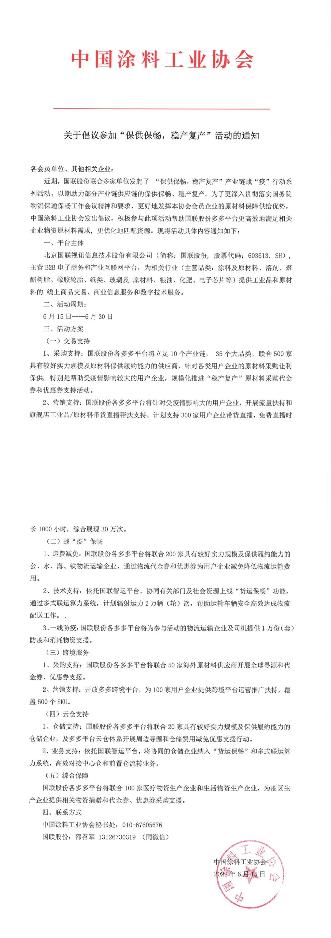 6月15日,中国涂料工业协会发布通知文件,倡议会员单位及相关企业,参与国联股份“保供保畅、稳产复产”产业链战役支援行动。