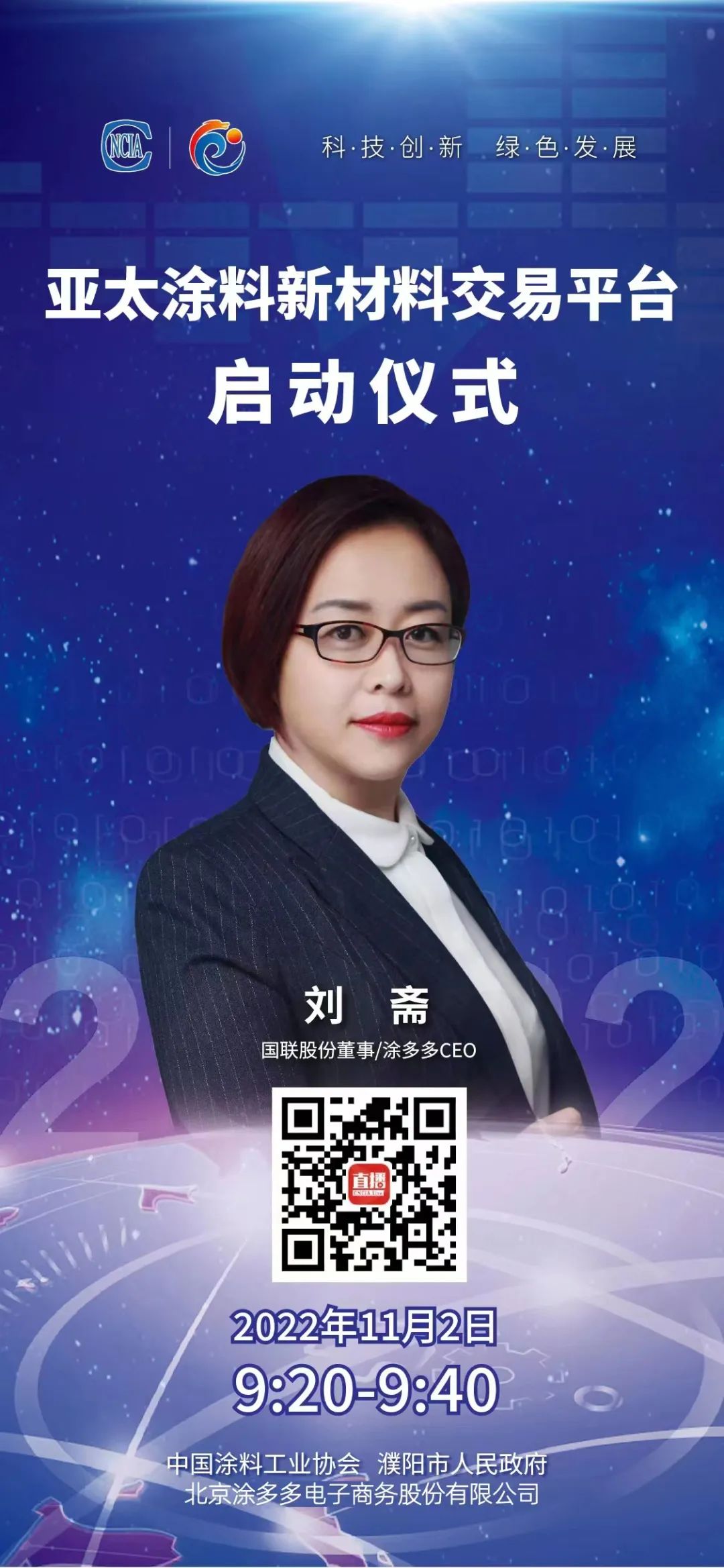 11月2日,由中国工业涂料协会、濮阳市人民政府联合主办的亚太国际涂料产业发展大会在线直播召开。会议中,中国涂料工业协会会长 孙莲英 、濮阳市市委书记 杨青玖 、国联股份董事/涂多多CEO 刘斋 共同启动亚太涂料新材料交易平台。