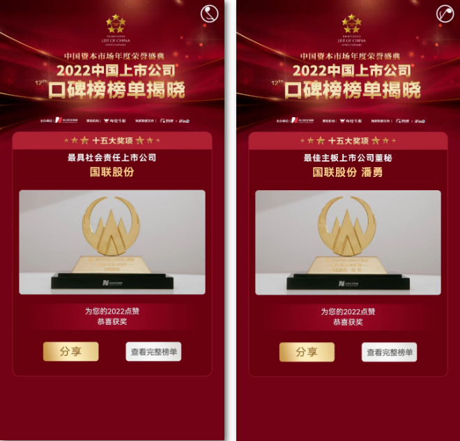 近日,中国资本市场年度荣誉盛典——“2022第十二届中国上市公司口碑榜”重磅发布。国联股份荣获“最具社会责任上市公司”奖项,同时,国联股份高级副总裁、董秘潘勇荣获“最佳主板上市公司董秘”奖项。