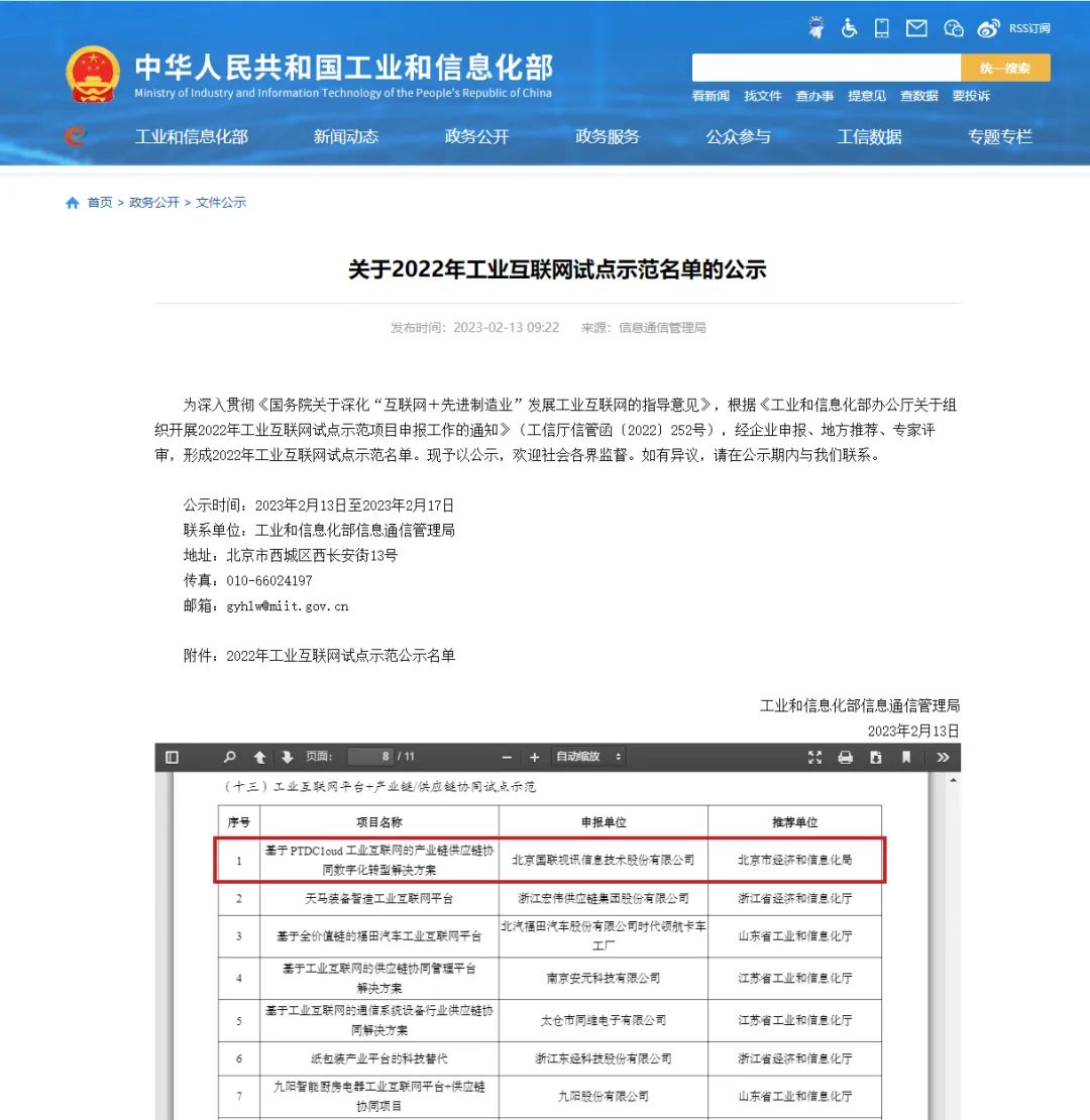 近日,根据《工业和信息化部办公厅关于组织开展2022年工业互联网试点示范项目申报工作的通知》(工信厅信管函〔2022〕252号),经企业申报、地方推荐、专家评审,最终形成了2022年工业互联网试点示范名单,国联股份凭借“基于PTDC1oud工业互联网平台的产业链供应链协同数字化转型解决方案”成功入选。