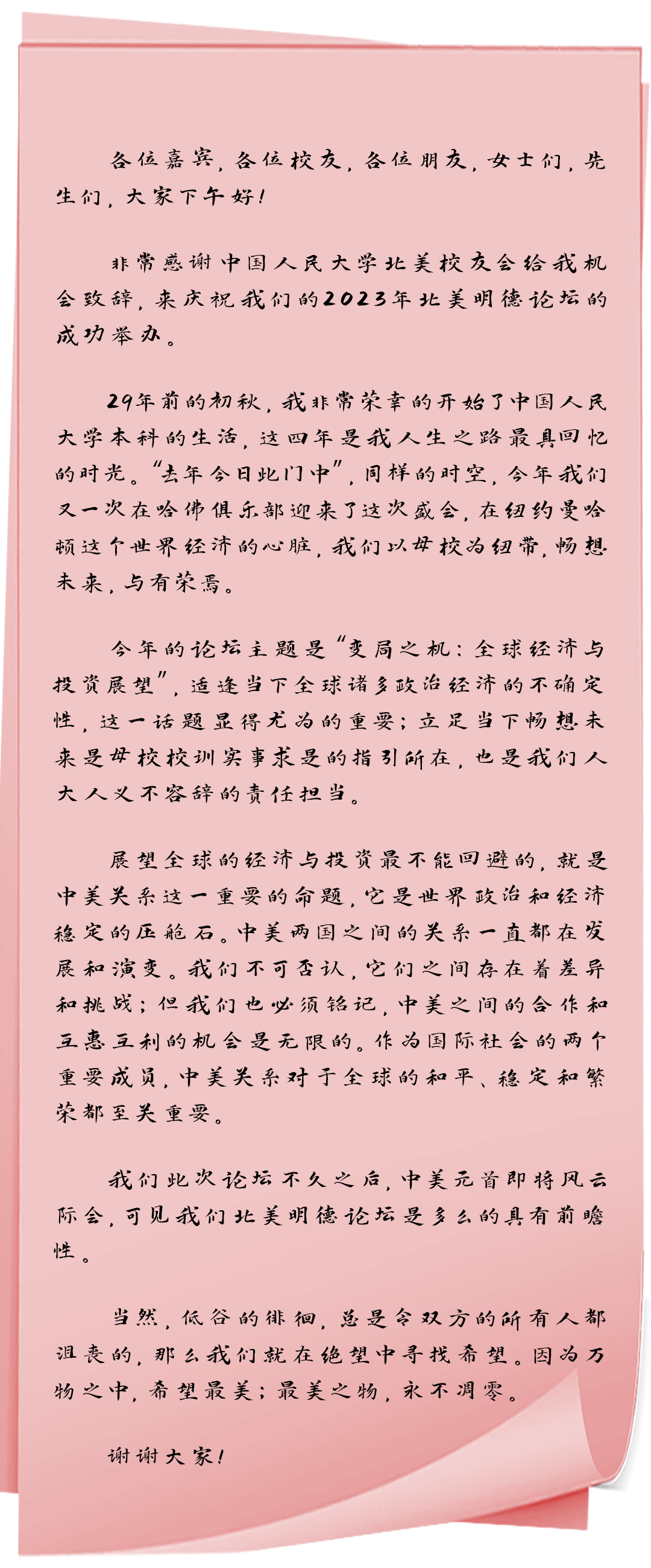 2023年11月11日,中国高校在美国最具有影响力的论坛之一,北美明德论坛在纽约曼哈顿哈佛俱乐部举办,中国人民大学校长林尚立发表视频致辞;会议由中国人民大学北美校友会会长、95级校友吴亚锋先生等组织。