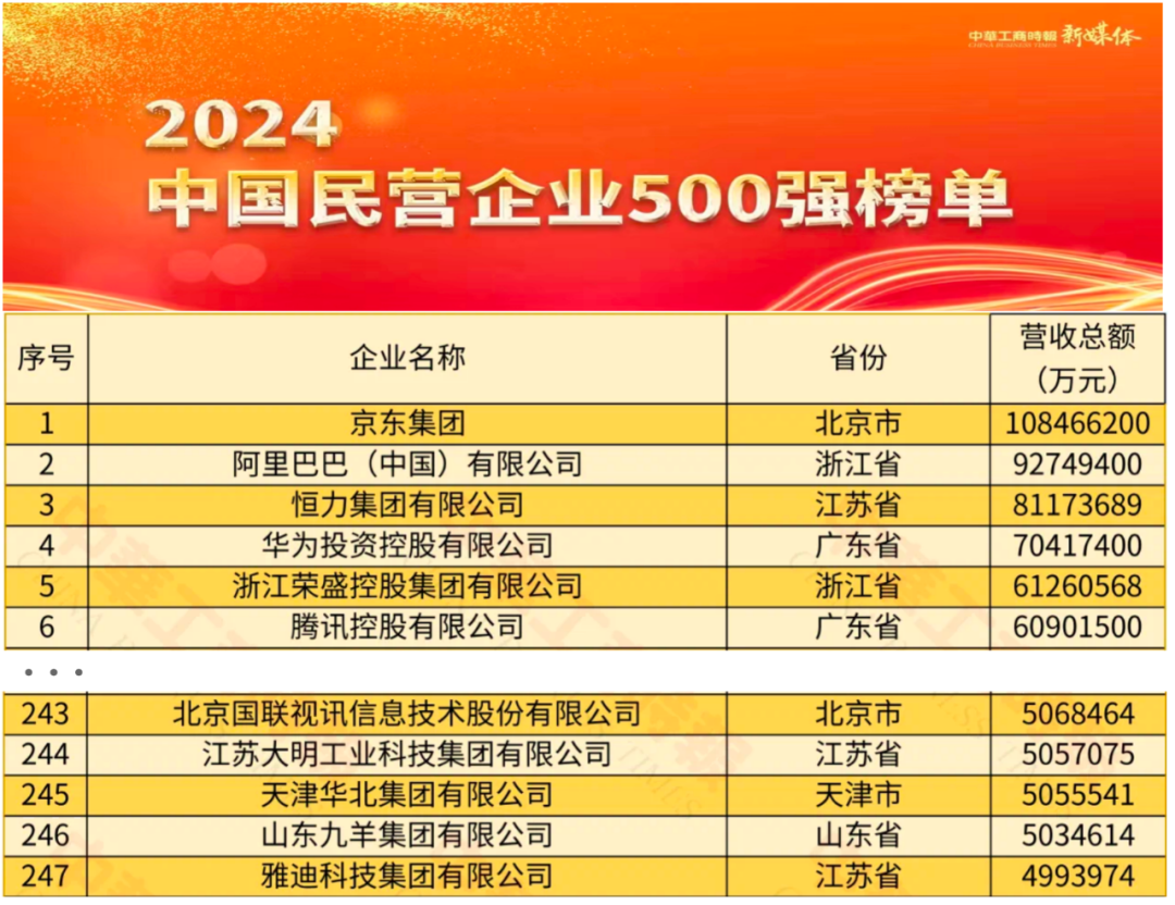 近日,全国工商联权威发布“2024中国民营企业500强榜单”和“2024中国服务业民营企业100强榜单”。