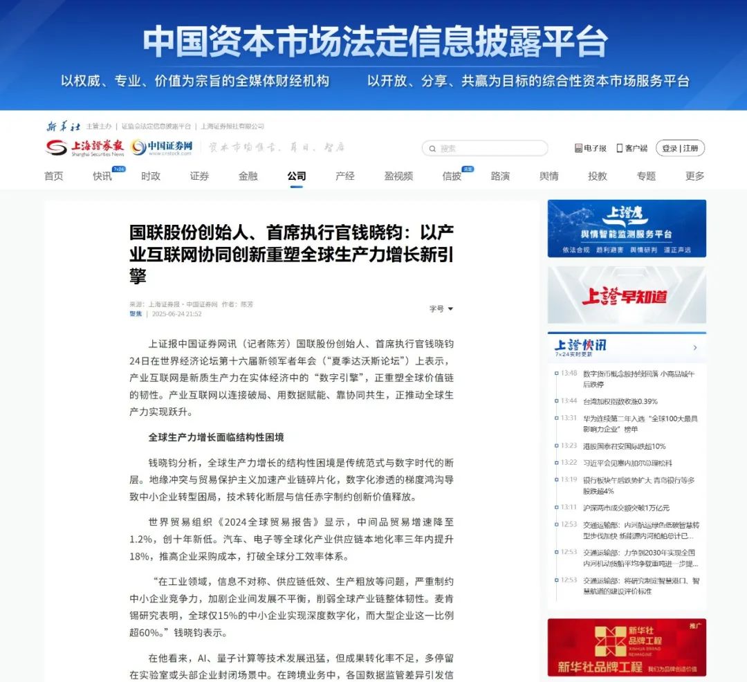 上证报中国证券网讯(记者陈芳)国联股份创始人、首席执行官钱晓钧24日在世界经济论坛第十六届新领军者年会(“夏季达沃斯论坛”)上表示,产业互联网是新质生产力在实体经济中的“数字引擎”,正重塑全球价值链的韧性。产业互联网以连接破局、用数据赋能、靠协同共生,正推动全球生产力实现跃升。